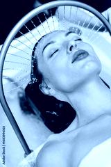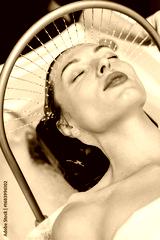 Woman enjoying hydromassage therapy in a serene spa environment, water cascading gently over her head, promoting relaxation and rejuvenation through soothing aqua massage techniques