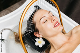 Woman enjoying hydromassage therapy in a spa setting, relaxing with water flowing gently over her head, surrounded by calming ambiance and soothing elements for ultimate relaxation experience