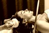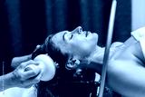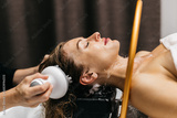 Woman receiving hydromassage head treatment in a serene Japanese spa environment, relaxing with water and massager, promoting wellness and rejuvenation through soothing techniques