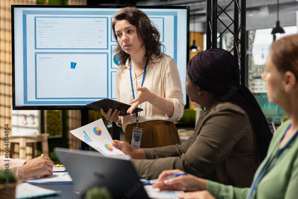 Collaborative team of professional women reviews key data and reports while setting strategy for business growth, aligning insights with development goals and teamwork. Networking.