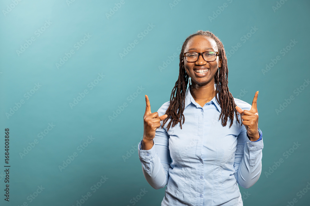 Cheerful black female individual gestures upwards with her fingers, smiling as she presents a product on isolated backdrop. African american woman pointing up, directing attention to promotional space