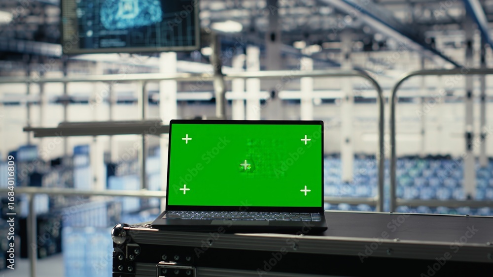 Green screen laptop in server hub with hardware supporting AI driven services. Mockup notebook in data center storing and processing vast datasets for artificial intelligence operations