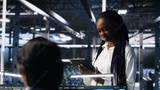 Team of data center developers doing brainstorming, monitoring neural network AI LLM. Teamworking colleagues in high tech facility oversee servers powering machine learning processes, camera A