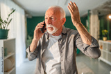 Senior man gesturing while talking on smart phone at home