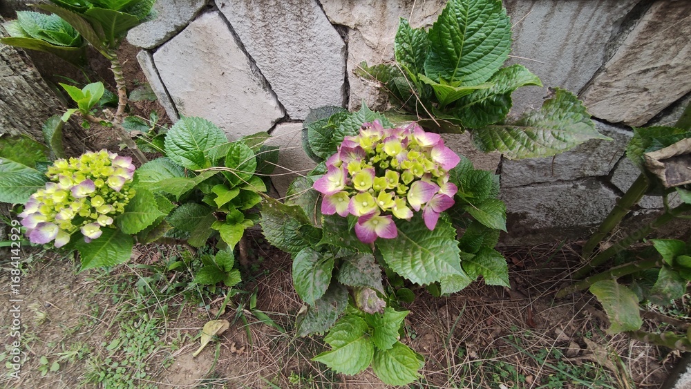 Hydrangea flowers growing by a stone wall with fresh green leaves and colorful petals in bloom. This photo is perfect for garden themes, nature photography, floral design,