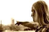 Senior man pointing with finger in monochrome analog style photo