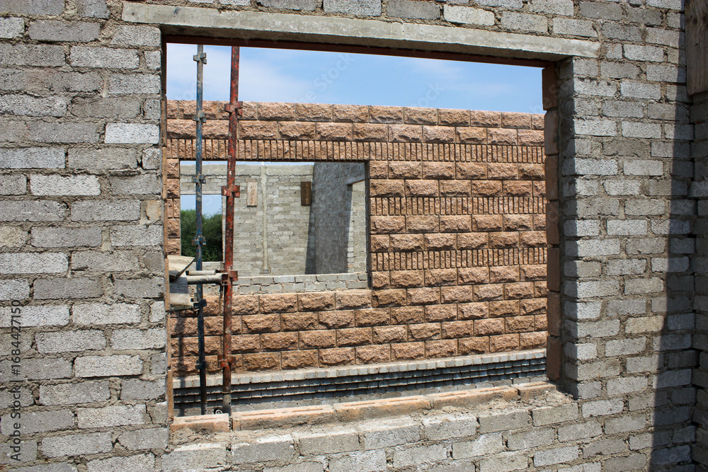 construction site, landscape view through the windows, brick walls and scaffolding , outdoor view