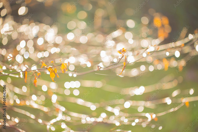 Abstract autumn background - Branches with reflecting dew drops and some golden leaves