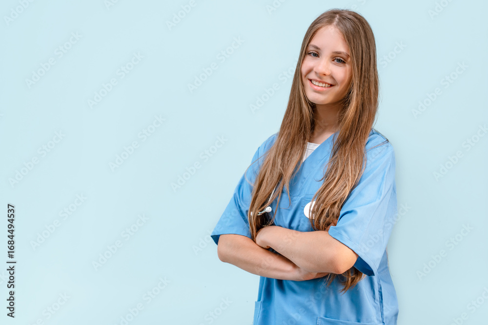 Portrait of a young Caucasian female doctor in a blue uniform on an isolated background. intern or children's doctor. place for text