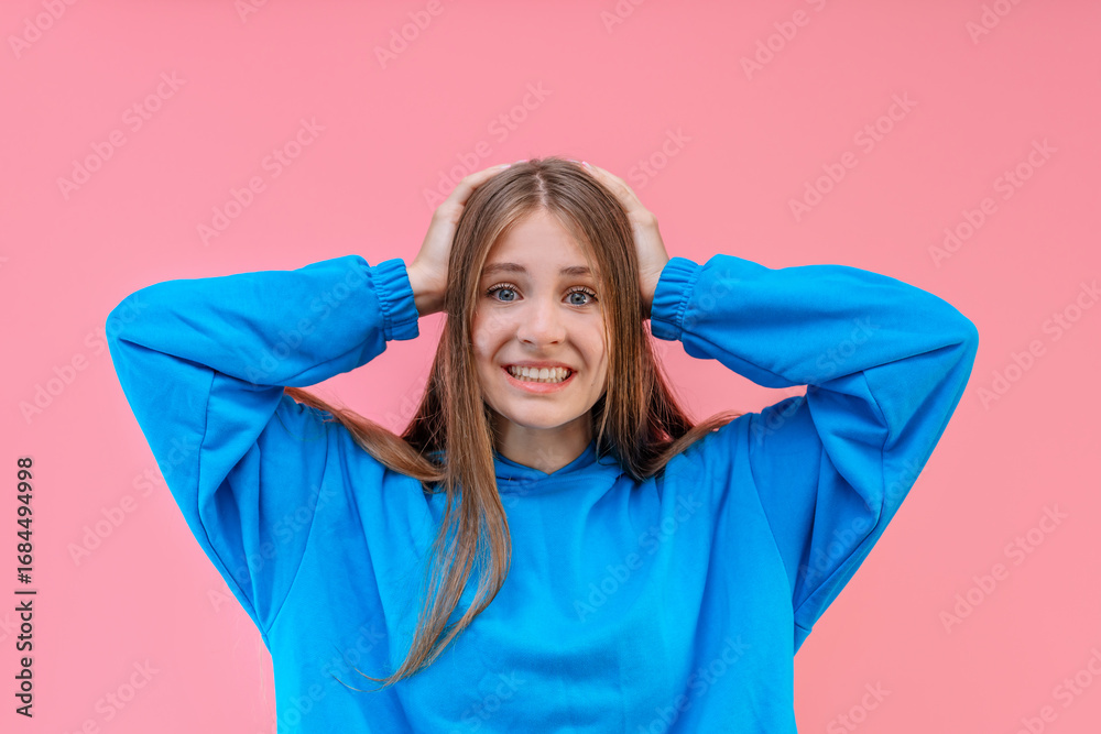 Attractive young girl clenches her teeth in horror and clutches her head against an isolated background, the place is full of text, the girl is scared and sorry