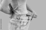 A young girl in oversized jeans shows the result of weight loss on an isolated pink background