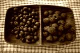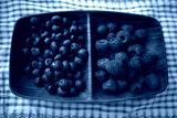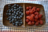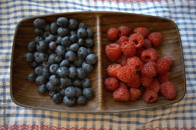 Fresh raspberries and blueberries served on a rustic wooden plate, close-up view.