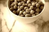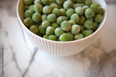 Frozen green peas in a white ceramic bowl on a marble surface with copy space.