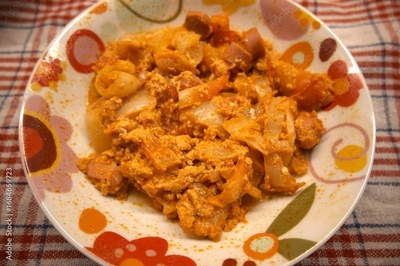 Homemade Hungarian vegetable stew, lecsó, served in a bowl, close-up view.