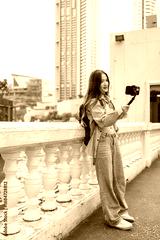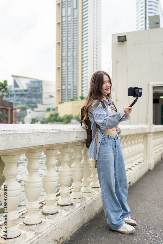 Asian beautiful woman backpacker taking a selfies outdoors in the city.