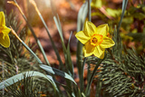 Yellow flower lent lily. Spring background with and green leaves. Gardening floriculture.
