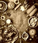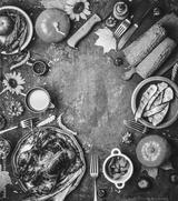 Thanksgiving dinner background with roasted turkey , sauce , pumpkin and dishes of autumn vegetables on rustic background, top view, frame