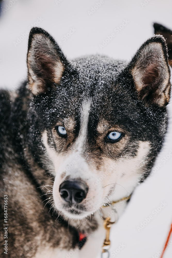Siberian husky in Lapland’s winter wonderland, symbol of strength, endurance, and northern beauty.