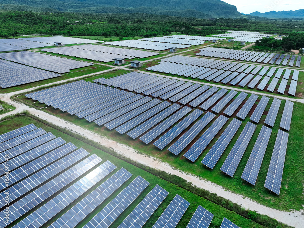 Aerial view of solar farm. Sustainable renewable energy and modern photovoltaic technology for eco-friendly electricity production. Solar power station. Green energy solutions. Solar panel technology.