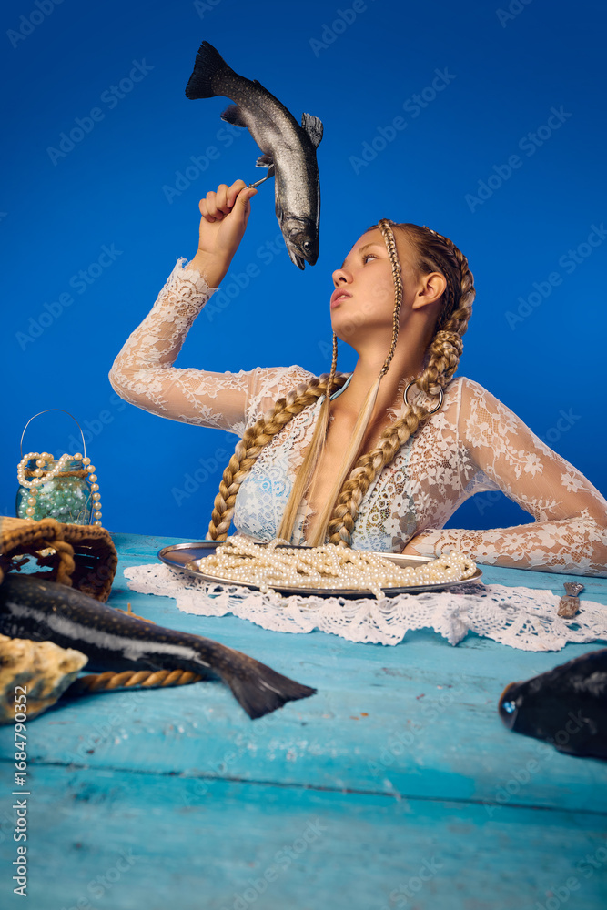 Young woman with braids holding fish above face with upward gaze against blue background. Concept of food advertising, abstract culture, seafood identity, and experimental artistic fashion.
