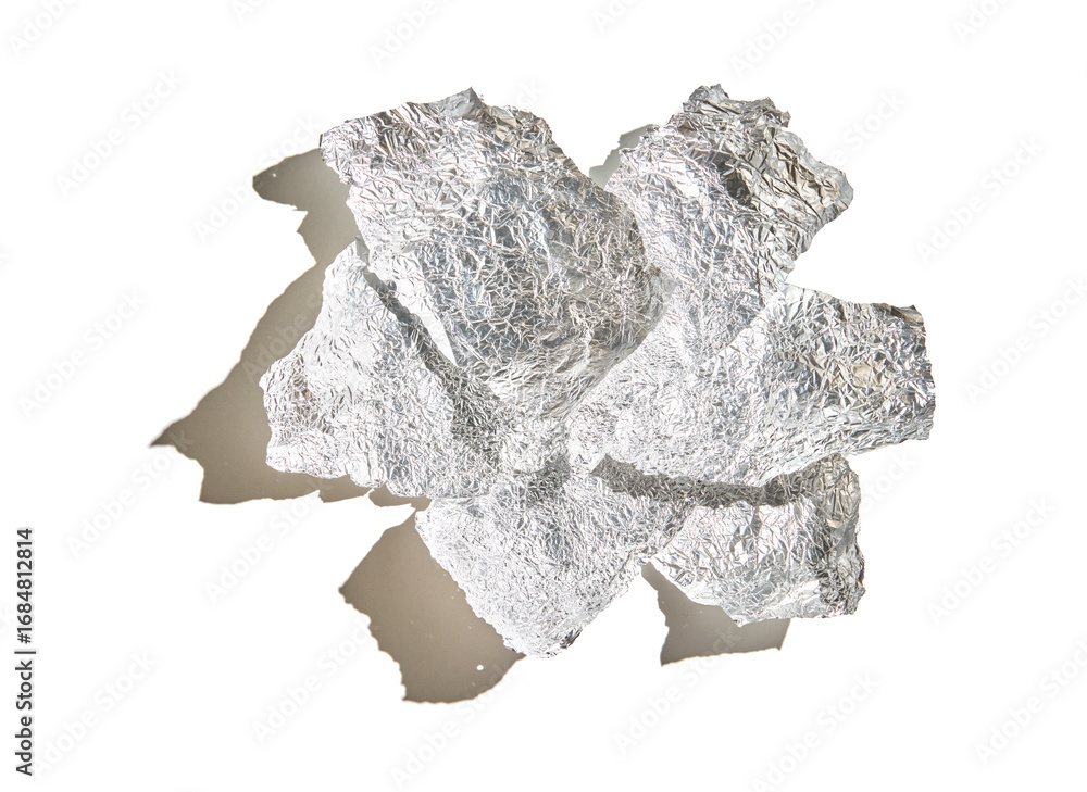 Crumpled aluminum foil in abstract flower shape with shadow on white background.