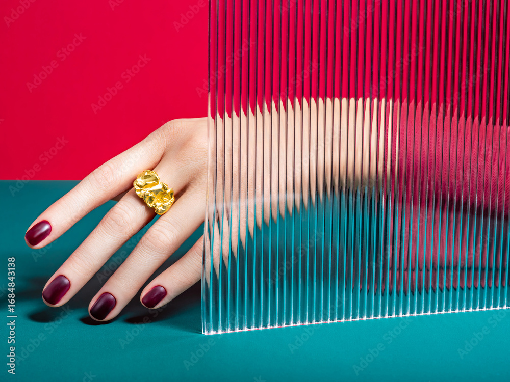 Burgundy manicure and gold ring behind fluted glass on vibrant background