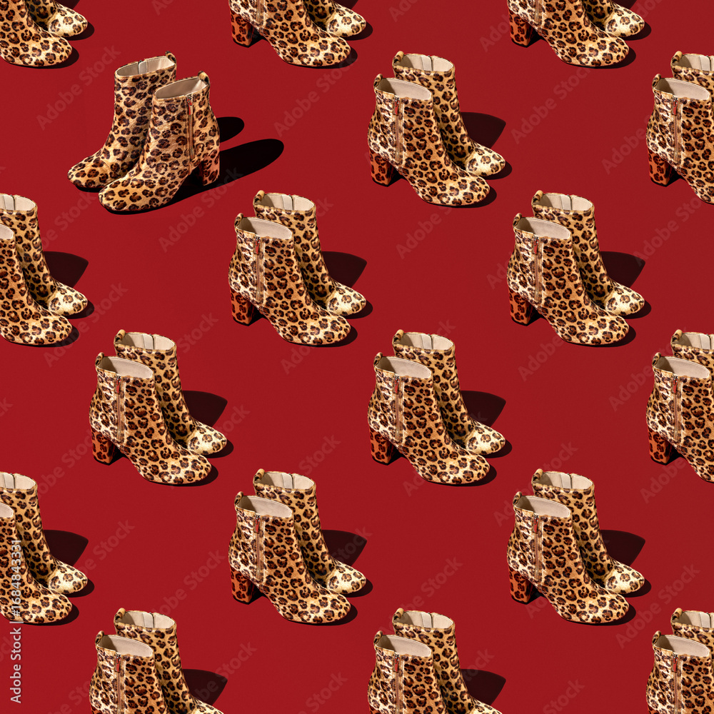 Leopard boots pattern with unique pair standing out – individuality and nonconformity concept