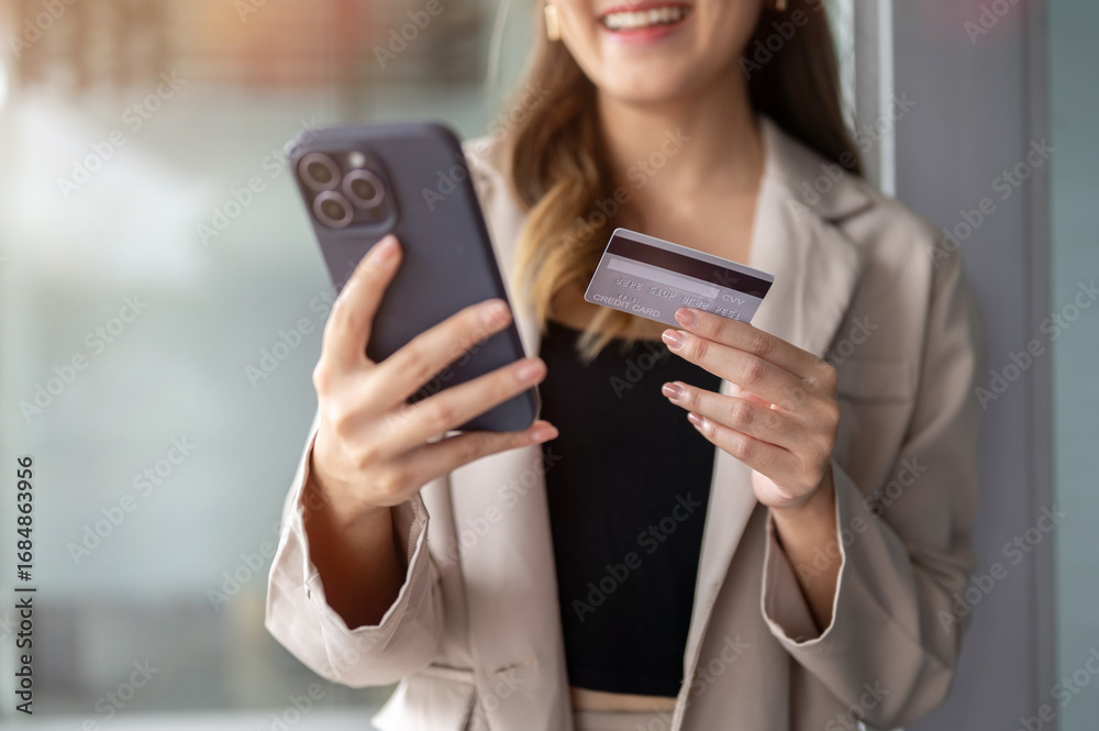 Close up of a smiling woman holding smartphone and a credit card in front of a store's glass wall.