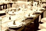 celebration, supper, restaurant business concept. oaken table covered with white tableware lying in center and served for starting banquet and decorated with beautiful small bunches and transparent