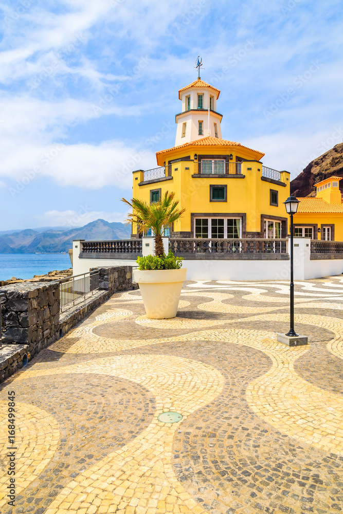 Square with lighthouse building on coastal promenade, Madeira island, Portugal