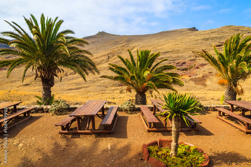 Picnic tables in palm tree oasis in desert landscape on trekking trail at Punta de Sao Lourenco peninsula, Madeira island, Portugal