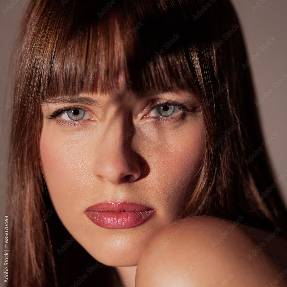 Close up female face with intense gaze and natural makeup in strong light and shadow contrast. Concept of beauty skincare, mental health balance, editorial portrait, and advertising design.