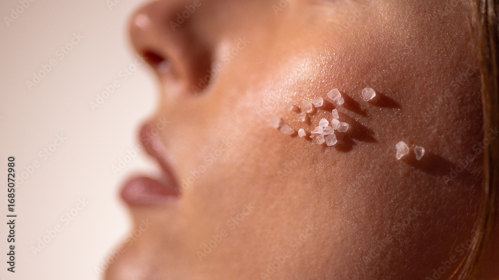 Macro detail female cheek with sea salt crystals for natural skincare ritual. Concept of clean beauty, dermatology care, wellness advertising, and eco lifestyle aesthetics.