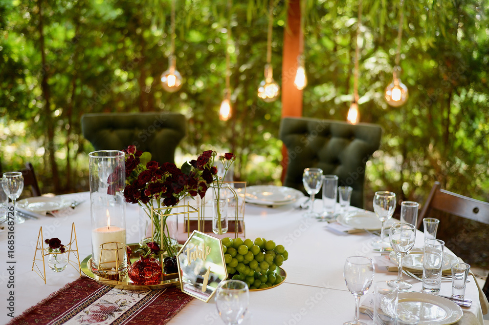 Banquet table for a wedding or anniversary. Red roses. Classic layout. Glasses and white plates. In the fresh air