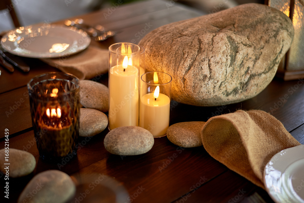 Candles, stones and burlap. An unusual decoration for a dinner or celebration in the Viking style.