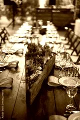 Decoration of wedding tables of guests in the Viking style. Heavy wooden tables and compositions made of moss, stones and junipers. Burlap and plain fabrics. History.
