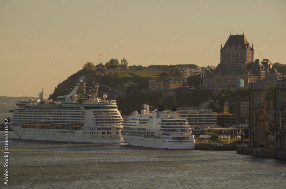 Huge modern cruise ship cruiseship liner Explorer or Adventure in port of Quebec City, Canada with historic old town and modern downtown cityscape skyline during New England Indian Summer cruising