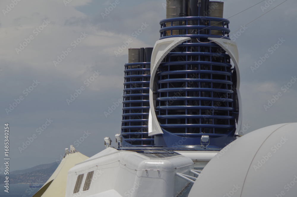 Blue and black painted funnel smoke stack of luxury cruiseship cruise ship liner against blue sky