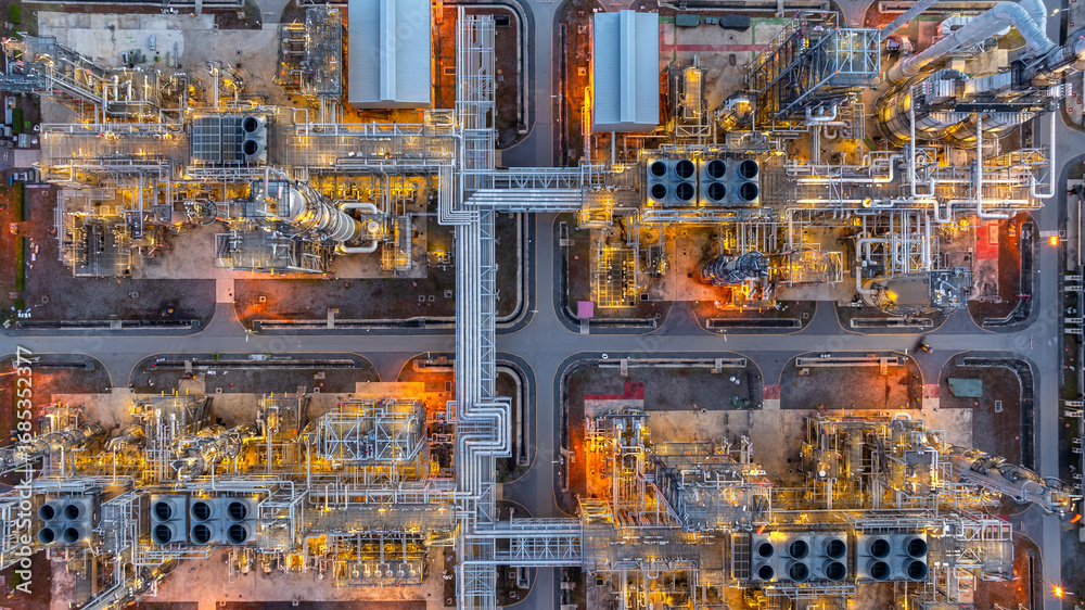 Aerial view oil and gas refinery plant at night, Top view oil and gas refinery, Oil and gas refinery petrochemical industrial, Petrochemical refinery industrial energy supply chain.