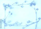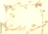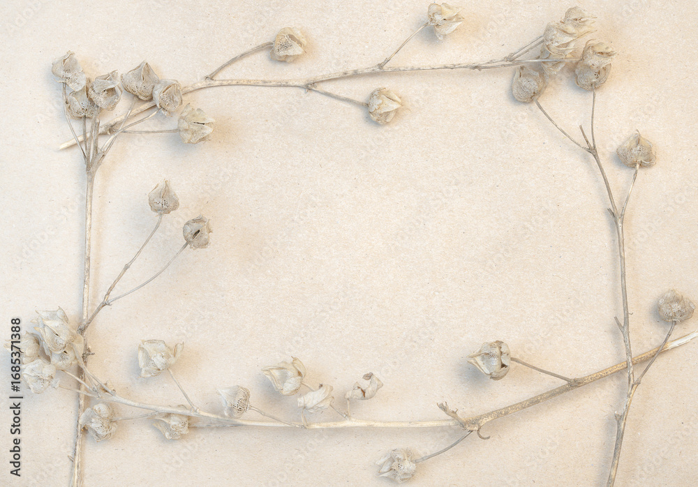 Macro photo of dried beige hollyhock buds forming frame on kraft paper