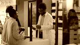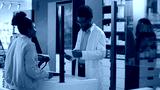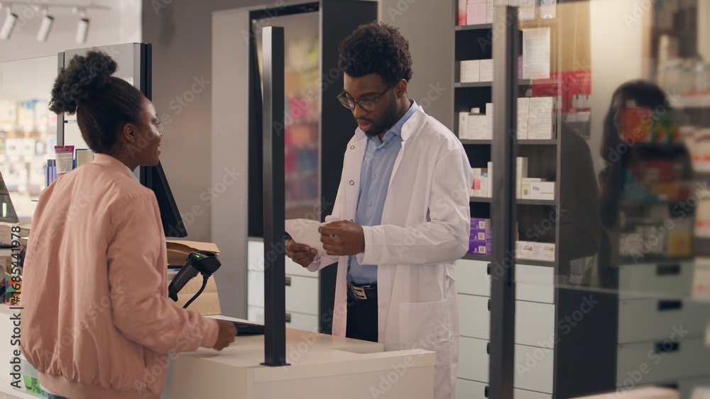 Professional medical worker African American man pharmacist packing medicine health care products in pharmacy customer buying pills healthy purchase paper bag medication at cashier counter drugstore