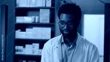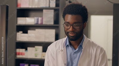 Professional medical worker African American man pharmacist packing medicine health care products in pharmacy customer buying pills healthy purchase paper bag medication at cashier counter drugstore