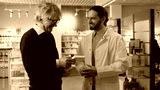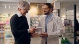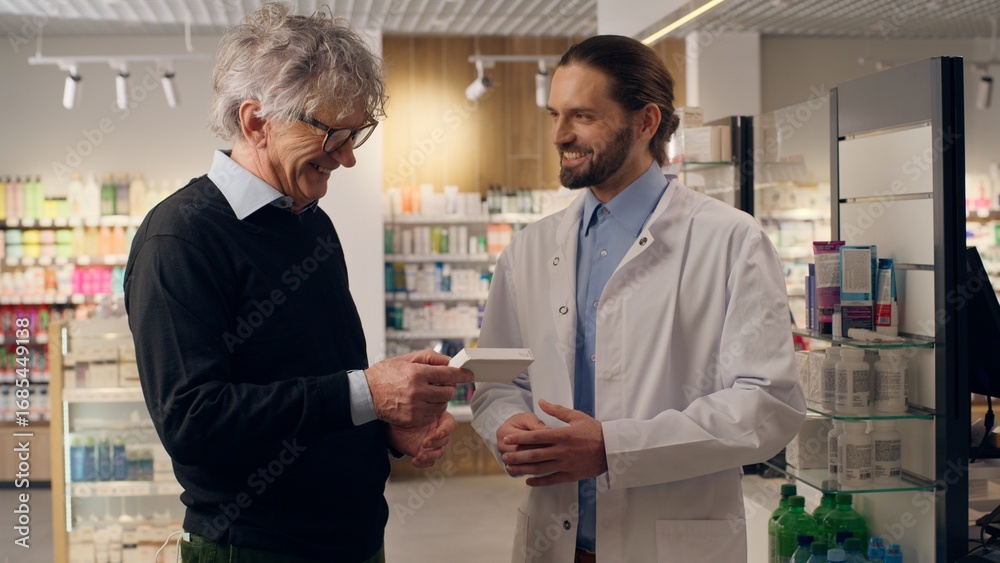 Mature old patient pharmacist talking medication help buying medicine in pharmacy cardiac pills drugs healthy vitamins friendly smiling men doctor professional assisting customer medical healthcare