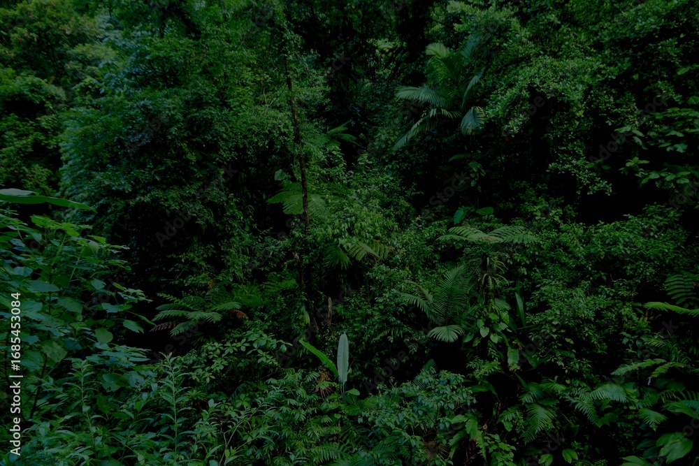 Nature in Guadeloupe Caribbean island. Dark green rainforest background.