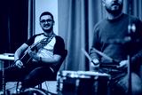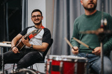 Two musicians collaborate while playing guitar and drums in a modern music studio. The atmosphere is creative and engaging, capturing the essence of teamwork and musical exploration. Ideal for
