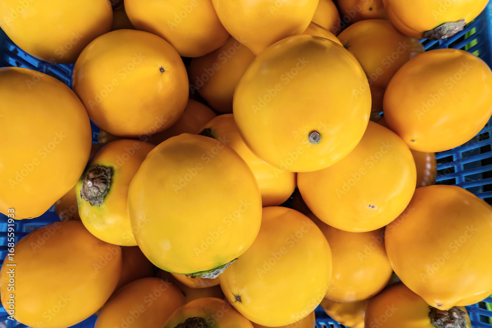 Fruit Known as False mangosteen, gamboge, yellow mangosteen, Himalayan Garcinia, or sour mangosteen (Garcinia xanthochymus) at a Market near Banting, Sarawak, Borneo, Malaysia