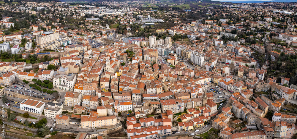 An aerial panorama view around the old town in the city Annonay in France on a sunny morning in early spring