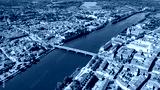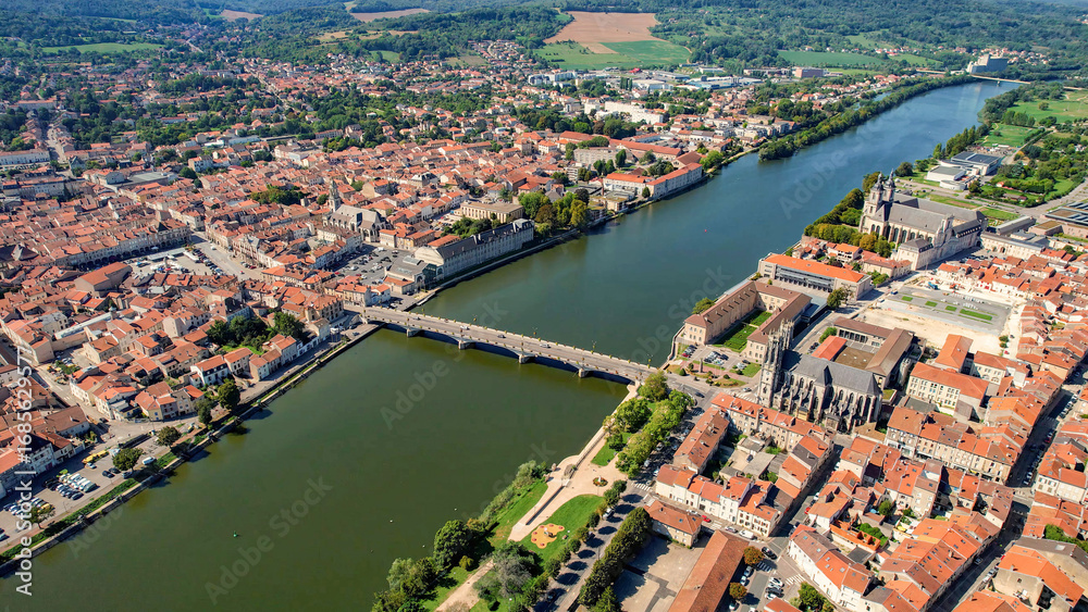 An aerial panorama view around the old town in the city Pont-à-Mousson in France on a sunny afternoon in early spring