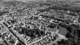 An aerial panorama view around the old town in the city Verdun in France on a sunny afternoon in early spring