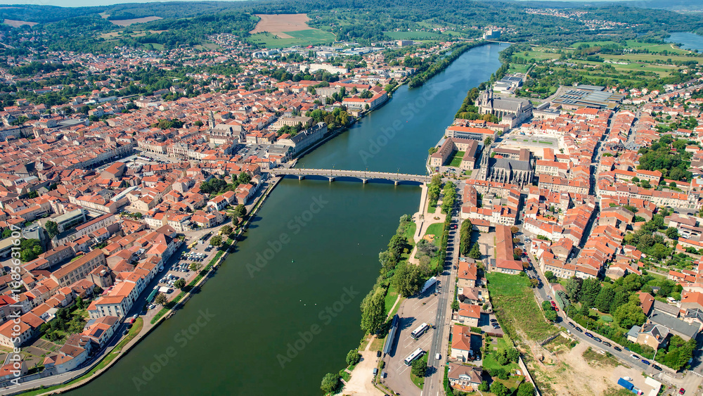 An aerial panorama view around the old town in the city Pont-à-Mousson in France on a sunny afternoon in early spring